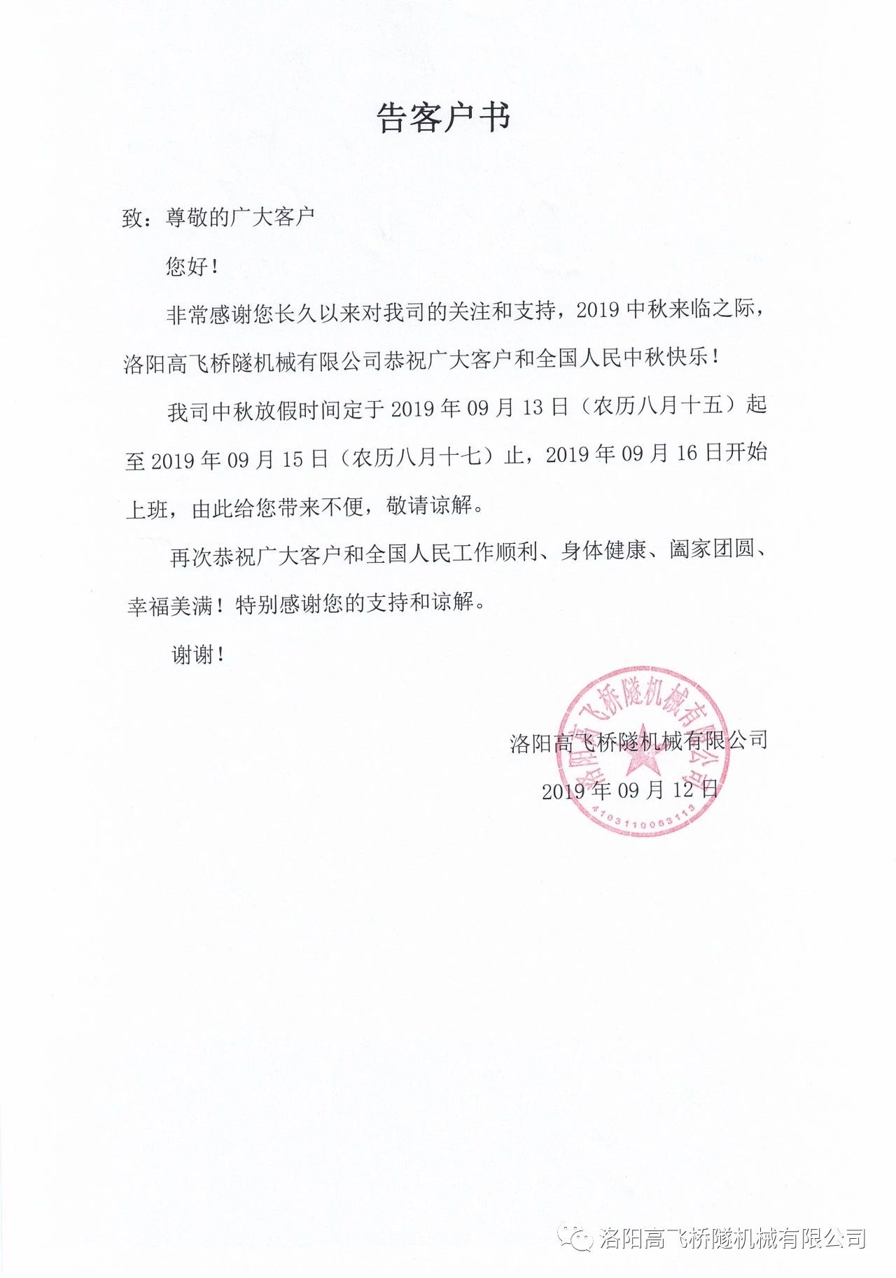 月到中秋分外明,月光如水憶前情。月圓同聚賞華月,月下淚襟聊人生。值此中秋之際,我司定于2019年09月13日(農(nóng)歷八月十五)起至2019年09月15日(農(nóng)歷八月十七)止放中秋假,2019年09月16日開始上班,由此給您帶來不便,敬請諒解。